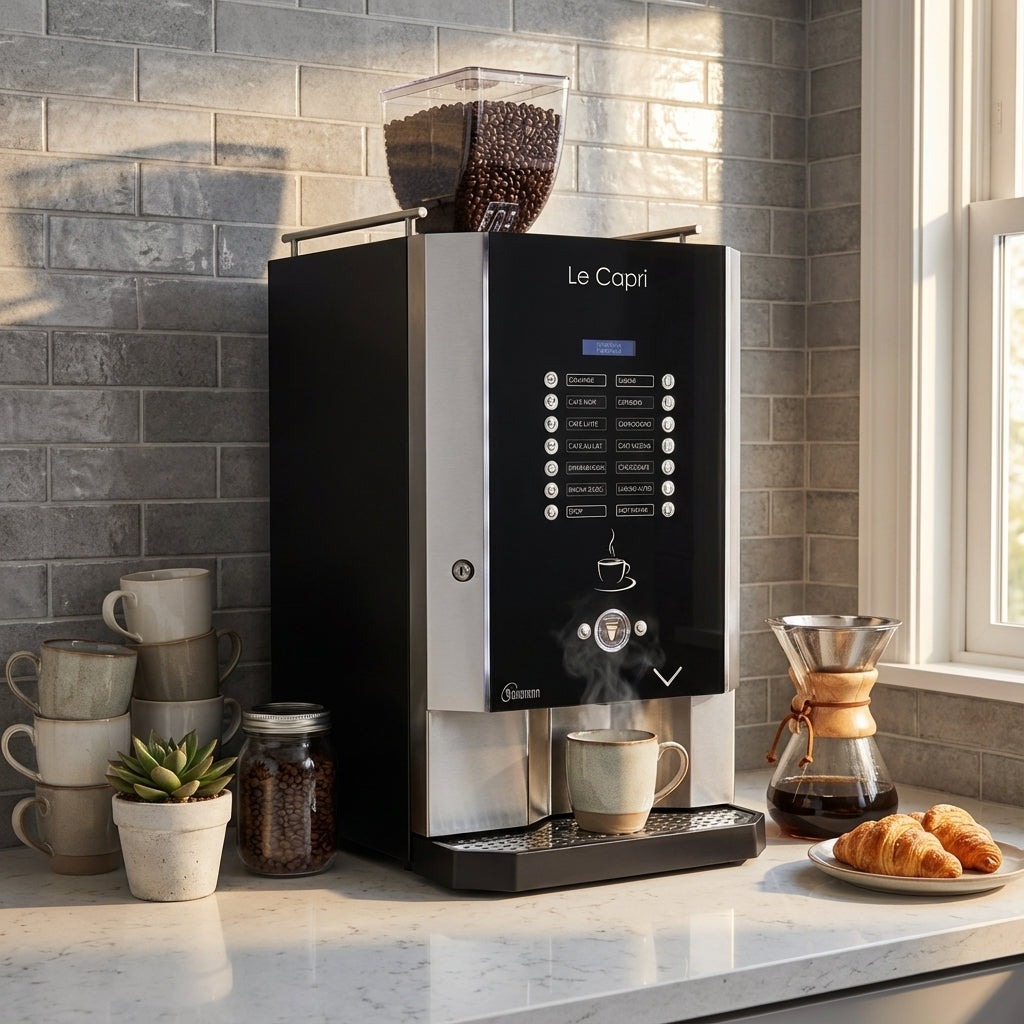 An expertly engineered table-top bean to cup machine combining proven technology with rugged dependability and design to complement any environment. Le Capri’s ‘true’ espresso brewing system boasts a fully adjustable grinder to produce the perfect espresso, time after time.